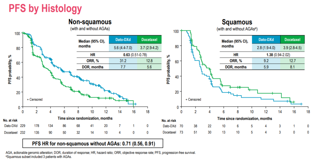 进一步的组织学分层结果提示,非鳞NSCLC是Dato-DXd潜在获益优势人群。相较ITT人群,非鳞NSCLC人群的中位PFS获益提升近2个月(5.6 vs 3.7个月),取得了显著的临床获益,并使疾病进展或死亡风险下降了37%(HR 0.63;95%CI:0.51~0.78)。此外,Dato-DXd组确认的ORR为31.2%,包括4例完全缓解(CR)患者,多西他赛组ORR为12.8%,没有观察到CR患者。