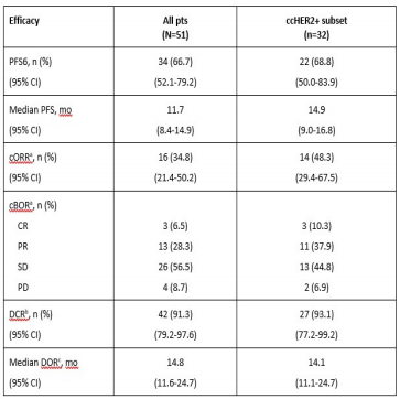 主要终点PFS6为67%(ccHER2+亚组为69%)。mPFS为11.7个月(ccHER2+亚组为14.9个月)。其他疗效终点请参见表1。29例患者(57%)可以获取PAM50亚型分型(1例基底样;16例HER2富集型;12例luminal B)。与HER2富集型相比,luminal B型患者的mPFS(11.7个月vs 9.3个月;P=0.74)和PFS6(66.7%vs 62.5%)在数值上更好,但在统计学上无显著差异。