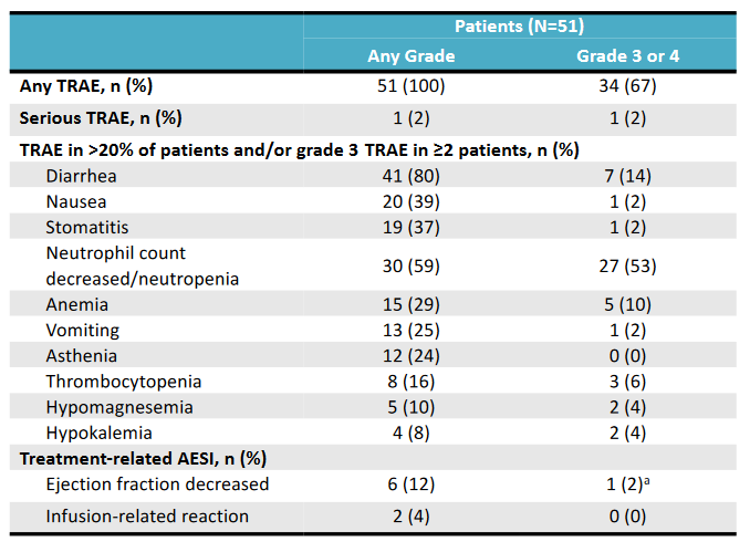 治疗(zani,palbo和/或fulv)相关的最常见(>20%)不良事件(TRAEs)包括:腹泻(80%)、中性粒细胞计数减少/中性粒细胞减少症(59%)、恶心(39%)、口腔炎(37%)、贫血(29%)、呕吐(25%)和虚弱(24%)。发生2例及以上的≥3级TRAEs包括:中性粒细胞计数减少/中性粒细胞减少症(53%)、腹泻(14%)、贫血(10%)、血小板减少症(6%)、低钾血症(4%)和低镁血症(4%)。报告了1例严重TRAE(转氨酶增高)。特别关注的不良事件:6例患者发生心脏事件(全部LVEF减少;5例患者有1或2级事件,1例患者有3级事件),2例患者发生输注相关反应(均为1级)。由于不良事件,3例患者停用了Palbo;1例患者因不良事件停用了Zani和Fulv。未报告与治疗相关的死亡。