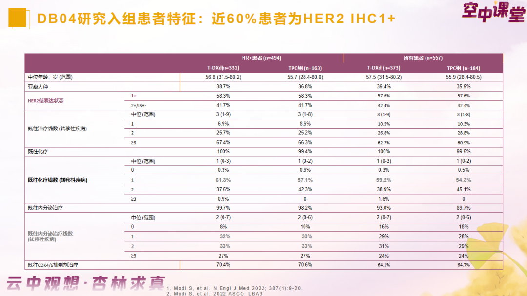 DB-04是首个验证HER2低表达mBC靶向治疗可带来生存获益的3期研究[19],入组既往接受过1-2线晚期化疗的HER2低表达mBC患者(包括HR+和HR-患者),随机(2:1)接受T-DXd或医生选择的化疗(TPC)。从入组患者特征来看,有近60%的患者为HER2 IHC 1+。