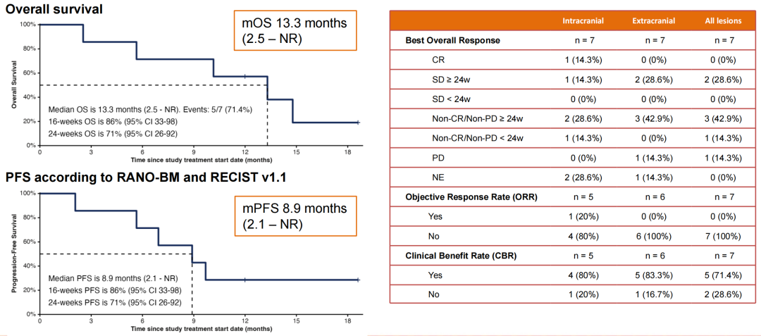 2021年4月14日-2022年4月5日,队列5纳入7例患者。中位年龄为57岁(范围,42岁-69岁),3例(42.9%)患者为HER2[+],6例(85.7%)患者同时患有颅外转移,其中2例(28.6%)出现BM,3例(42.9%)患者患有的疾病在可控范围内。晚期病变的既往治疗方案的中位数为4(范围,1-8),无患者接受与中枢神经系统相关的既往局部治疗。在数据截止日期(2023年4月4日),中位随访时间为12个月(范围,2.5-18.6)。治疗持续时间的中位数为9.0个月(范围,2.1-18.6)。2例(28.6%)患者仍在接受治疗:1例HER2+和1例HER2-low患者分别在18.6个月和12.0个月后接受治疗。中位OS为13.3个月(95%CI,5.7-NA,P<0.001),达到主要终点。在5例疾病进展的患者中,无1例颅内进展。共有4例(57.1%)患者出现颅外进展,1例(14.3%)患者出现临床恶化。未观察到客观反应,但7例患者中有5例出现较长时间的疾病稳定(≥24周),总体CBR为71.4%(95%CI,29.0-96.3),RECIST v.1.1的中位PFS为8.9个月(95%CI,4.9-NA)。非血液学治疗相关不良事件(TEAEs)的任何等级(G)中,最常见的是恶心(57.1%;14.3%G3)、疲劳(42.9%;0%G3)、呕吐(42.9%;0%G3)、头痛(42.9%;0%G3)和尿路感染(42.9%;0%G3)。其中,贫血(42.9%;0%G3)和血小板减少(28.6%;14.3%G3)是最常见的血液学TEAEs。未报告肺间质病/肺炎病例。7例患者中有4例(57.1%)发生与治疗无关的严重TEAEs,1例发生与治疗相关的严重TEAE(恶心G3)。未报告治疗相关的死亡。