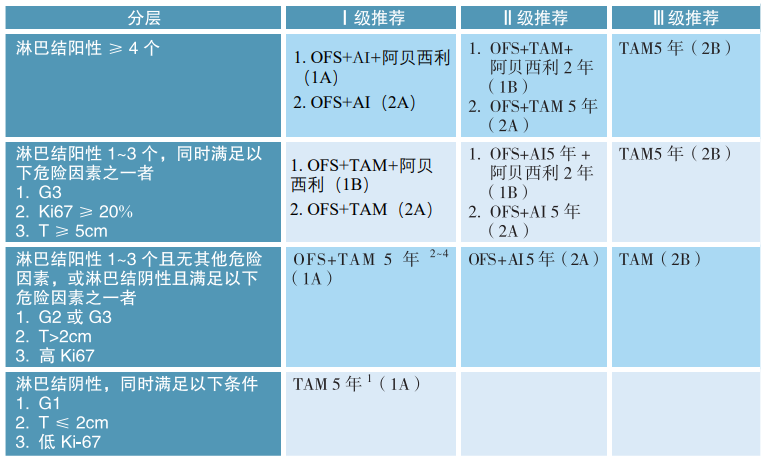 在辅助治疗方面,针对不同的绝经状态和风险分层,治疗方案也有所差异。对于绝经前的患者,治疗选择根据淋巴结阳性的数量、肿瘤的大小、等级以及Ki67指数来确,主要包括OFS+AI±阿贝西利、OFS+他莫昔芬(TAM)±阿贝西利等方案。