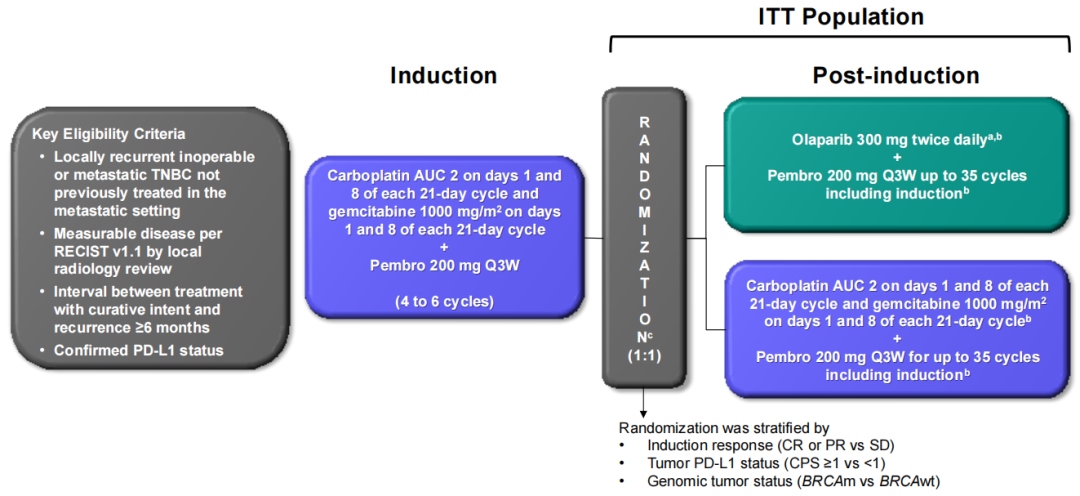 入组可测量病灶、局部复发且不可手术或转移性TNBC患者,既往未接受过化疗,先接受每3周(q3w)一次的帕博利珠单抗200 mg+化疗(卡铂AUC 2+吉西他滨1000 mg/m2,第1天和第8天)诱导治疗,最多6个周期。经过4—6个治疗周期后完全缓解(CR)、部分缓解(PR)或疾病稳定(SD)的患者按1:1的比例随机接受帕博利珠单抗200 mg Q3W+奥拉帕利300 mg每日两次或帕博利珠单抗+化疗维持治疗,直至疾病进展或毒性不可耐受,持续多达35个周期(包括诱导治疗)。根据诱导反应(CR或PR vs SD,根据RECIST v1.1)、肿瘤PD-L1状态(CPS≥1 vs CPS<1)和肿瘤基因组状态(tBRCAm vs tBRCAwt)对患者进行分层。双主要终点包括所有随机分组患者经过BICR根据RECIST v1.1评估的PFS和OS。次要终点包括PD-L1 CPS≥10的患者和tBRCAm患者的PFS和OS,以及安全性。