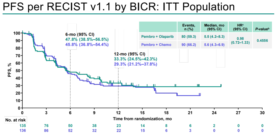 在460例接受诱导治疗的患者中,271例被随机分配到帕博利珠单抗+奥拉帕利组(n=135)或帕博利珠单抗+化疗组(n=136)。截至2022年12月15日,中位随访时间为17.2个月。与帕博利珠单抗+化疗相比,帕博利珠单抗+奥拉帕利维持治疗并未显著改善PFS(5.5 vs 5.6个月,HR 0.98,P=0.4556)或OS(50 vs 54个月,HR 0.95)。