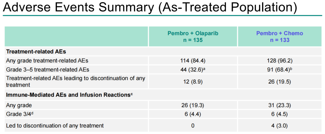 在135例接受帕博利珠单抗+奥拉帕利治疗的患者中有114例(84.4%)发生了治疗相关不良事件(TRAE),133例接受帕博利珠单抗+化疗的患者中有128例(96.2%)发生了TRAE。44例(32.6%)帕博利珠单抗+奥拉帕利治疗患者(死亡0例)和91例(68.4%)帕博利珠单抗+化疗患者(死亡2例[1.5%])发生≥3级TRAE,分别有12例(8.9%)和26例(19.5%)患者发生导致停药的TRAE。