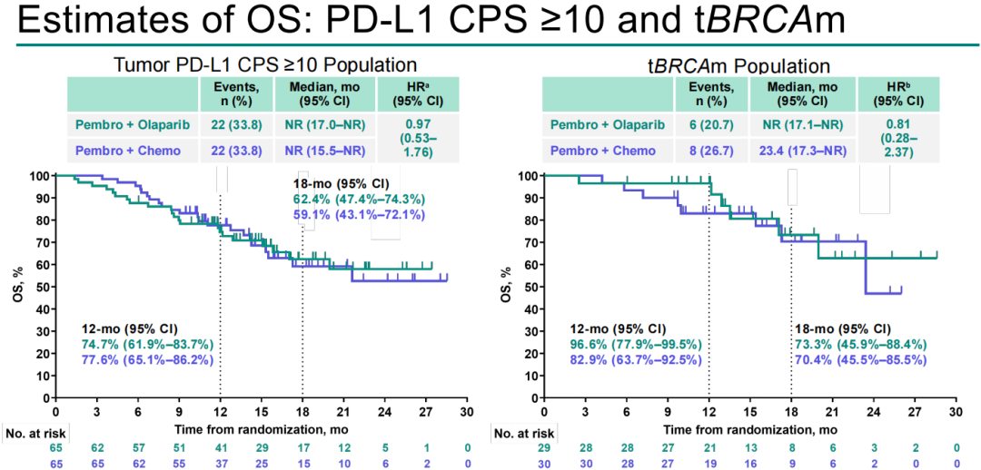 在tBRCAm患者中,与帕博利珠单抗+化疗相比,帕博利珠单抗+奥拉帕利的中位PFS更长(12.4 vs 8.4个月,HR 0.70),但在肿瘤PD-L1 CPS≥10的患者中则没有PFS获益(5.7 vs 5.7个月,HR 0.92)。肿瘤PD-L1 CPS≥10和tBRCAm患者的OS获益趋势也是如此。