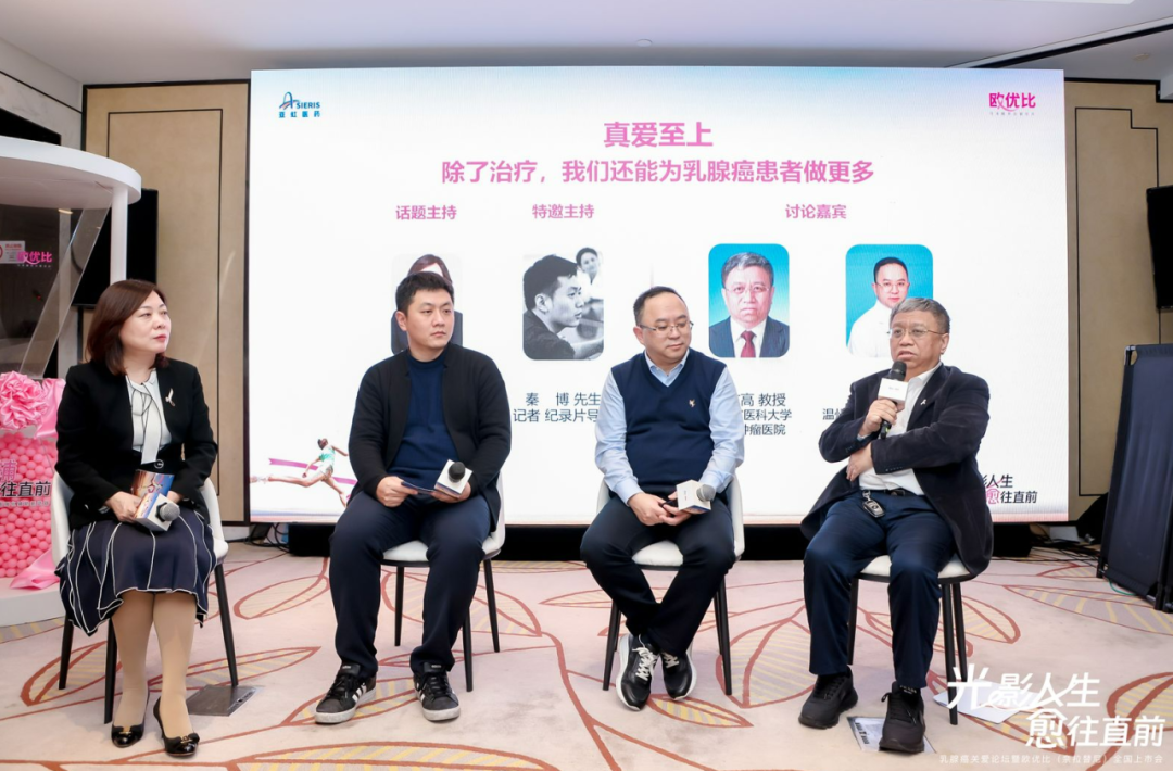 本环节由杨谨教授主持,温州医科大学附属第一医院王瓯晨教授、哈尔滨医科大学附属肿瘤医院李志高教授参与讨论。此外,秦博导演也作为特邀主持参与其中,在跨界交流中提供了不同视角的乳腺癌人文关怀。