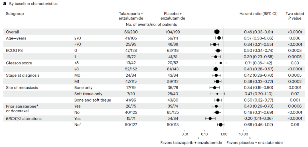 在预先设定的临床亚组中,观察到与rPFS一致的治疗效果。在149名之前接受过阿比特龙或orteronel(一种CYP17抑制剂)或多西他赛治疗的患者中,HR为0.43(95%CI: 0.26-0.70;P=0.0006)。在既往接受过阿比特龙或orteronel治疗的患者中(n=34),HR为0.53(95%CI: 0.20-1.42;P=0.20),在既往接受过多西他赛(n=117)患者的HR为0.39(95%CI: 0.22-0.69;P=0.0008)。在事后分析中,联合组BRCA1/BRCA2突变的患者影像学进展或死亡的风险降低80%(HR=0.20;95%CI: 0.11-0.36;P<0.0001);非BRCA1/BRCA2突变的患者风险降低32%(HR=0.68;95% CI: 0.46-1.02;P=0.06)。此外,在BRCA2单基因亚组、BRCA突变簇和CDK12突变簇中,观察到他拉唑帕利联合恩扎卢胺对rPFS的显著改善。