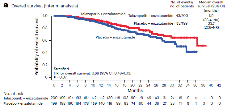 总生存(OS)数据仍然不成熟,大多数患者仍然存活:在数据截止时,他拉唑帕利组有43例(22%)患者死亡,安慰剂组有53例(27%)患者死亡。随后,根据治疗医师的判断,他拉唑帕利组的3名患者和安慰剂组的18名患者在后续治疗中接受了PARP抑制剂奥拉帕利的治疗。OS的HR为0.69(95%CI: 0.46-1.03;P=0.07)。在BRCA1/BRCA2突变和非BRCA1/BRCA2突变亚组中,OS的HR为0.61(95% CI: 0.31-1.23;P=0.16)和0.66(95% CI: 0.40-1.10;P=0.11)。