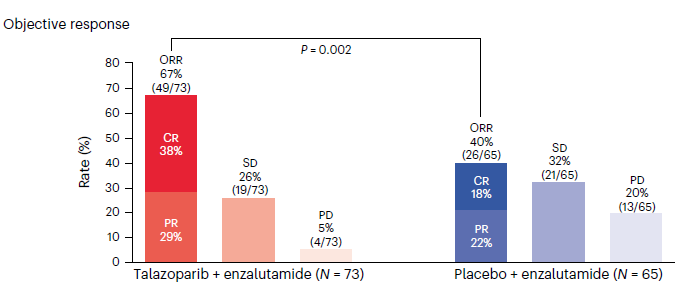 基线时可测量病灶患者的确认客观缓解率(ORR)在他拉唑帕利组为67%(49/73;95%CI: 55.1%-77.7%),而对照组为40%(26/65;95%CI: 28.0%-52.9%)。在他拉唑帕利组中,前列腺特异性抗原(PSA)进展时间、细胞毒性化疗开始时间和研究者评估的首次后续抗肿瘤治疗进展或死亡时间均显著延长。