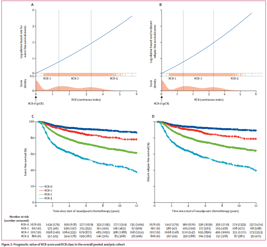 20世纪70年代后期,新辅助化疗诞生,用于局部晚期不能手术的乳腺癌患者的治疗。与辅助治疗相比,术前新辅助治疗可以缩小肿瘤体积并降低患者肿瘤分期,从而允许患者进行更多的乳房和腋窝手术,这也为患者的治疗提供了重要的预后信息。残留癌症负荷(RCB)评分于2007年首次提出,旨在通过提供一套标准方法来评估和量化新辅助化疗后乳腺和腋下淋巴结残留疾病的程度,从而解决这些缺陷产生一个连续的分数。但RCB的预后价值尚未在大型研究中被证实,且各分子亚型中RCB的预后价值是否存在差异也有待证实。Lancet Oncol发表过一项5161名患者的数据分析,证实了新辅助化疗RCB评分可预测所有亚型患者的长期预后。