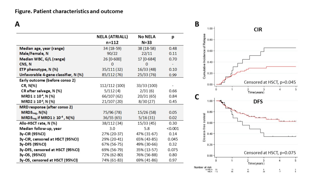 主要结果:ATRIALL/CNS-(n=112)与对照队列(n=33)患者表现出相似的特征,但对照队列患者中位随访期更长(图A)。ATRIALL/CNS-队列患者巩固治疗后达到了较低的MRD3水平(P=0.05)。在MRD1≥10-4的55例患者中,有36例(65%)在接受奈拉滨治疗后达到了不可检测的MRD3,有5例(31%)在接受SOC后达到了不可检测的MRD3(P=0.02)。当在HSCT时间进行审查时,奈拉滨与CIR的显著降低(SHR=0.48,95%CI:0.23~0.99;P=0.045)、DFS延长趋势相关(HR=0.52,95%CI:0.26~1.07;P=0.075)(图B、C)。当未在HSCT时间进行审查时,这一差异没有达到显著性。事实上,不符合HSCT条件的高危患者在CIR(SHR=0.43,95%CI:0.20~0.98;P=0.045)和DFS(HR=0.46,95%CI:0.21~1.03;P=0.06)方面获益于奈拉滨。非早期T细胞前体(ETP)ALL患者的CIR(SHR=0.03,95%CI:0.17~0.89,P=0.025)和DFS(HR=0.47,95%CI:0.22~0.99;P=0.048)显著改善,而ETP-ALL患者没有从奈拉滨治疗中获益。