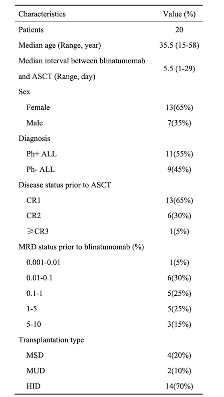 中文标题:短期倍利妥单抗桥接造血干细胞移植治疗低白血病负荷的急性B淋巴细胞白血病