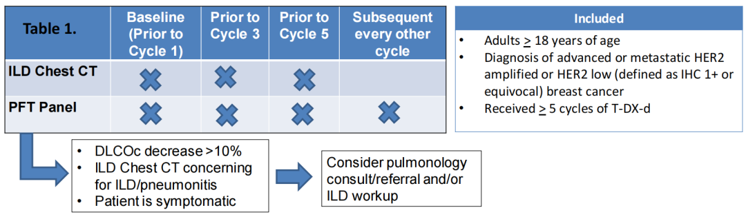 目前尚无针对T-DXd治疗患者的ILD/p标准监测方案。杜克癌症研究所的研究人员利用电子病例进行了一项回顾性研究[6],旨在探讨T-DXd治疗期间的ILD/p监测方案。该研究纳入33例接受≥5个周期T-DXd治疗的患者(27例HER2+,6例HER2-Low),在启动T-DXd治疗前(基线)、第3周期T-DXd治疗前和第5周期T-DXd治疗前进行胸部CT检查和一氧化碳弥散量(DLCO)等肺功能评估(PFT),当患者DLCO下降超过10%、有ILD/p症状或影像学表现时,则进行呼吸科会诊或转诊。