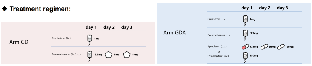 根据NCCN指南[7],T-DXd被归为具有高致吐风险的抗肿瘤药物,并推荐使用5-羟色胺-3受体拮抗剂(5-HT3RA)和地塞米松(DEX)及神经激肽-1受体拮抗剂的三联止吐药物。Manabu Futamura等人报道的一项II期研究[8],旨在评价在5-HT3RA+DEX基础上联合或不联合神经激肽-1受体拮抗剂(NK1RA)预防T-DXd相关恶心、呕吐的疗效和安全性。该研究在日本的14个中心入组了40例患者,随机接受格拉司琼+地塞米松(GD组)或格拉司琼+地塞米松+阿瑞匹坦(GDA组),具体的给药方案如下图。研究的主要终点是120小时内的呕吐完全缓解率(CR;无呕吐或抢救治疗)。