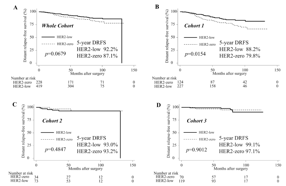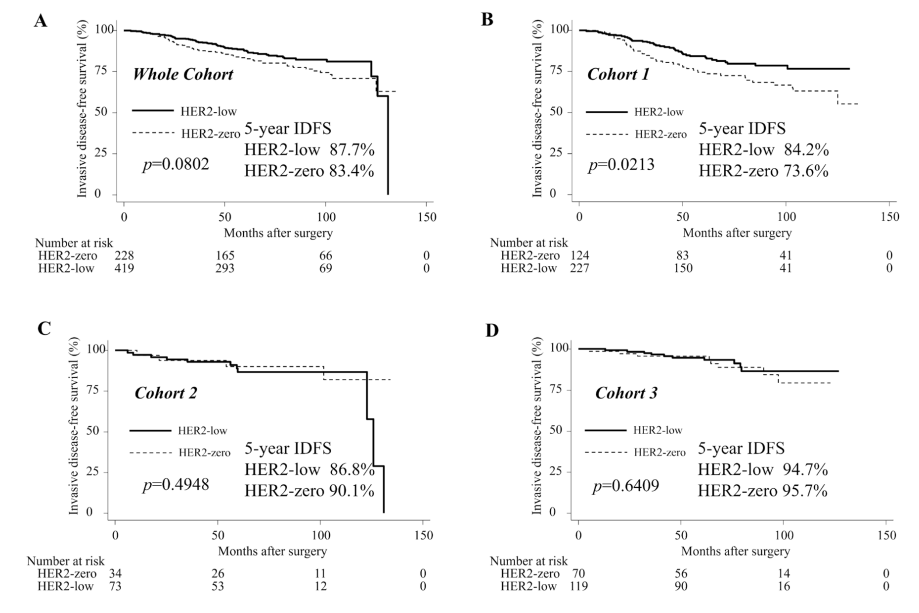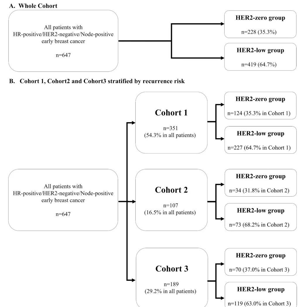 本研究回顾性纳入了2011年1月至2019年12月期间,在日本国家癌症中心的647例淋巴结阳性HR+/HER2-原发性早期乳腺癌患者,其中HER2 0 228例,HER2低表达419例。按复发风险分为三个队列,分别为队列1(351例):组织学分级(HG)为3或肿瘤大小≥5cm伴有腋窝淋巴结(ALN)阳性1-3枚,或ALN≥4枚;队列2(107例):HG<3、肿瘤大小<5cm、Ki67≥20%伴有腋窝淋巴结(ALN)阳性1-3枚;队列3(189例):HG<3、肿瘤大小<5cm、Ki67<20%伴有腋窝淋巴结(ALN)阳性1-3枚。比较每个队列HER2 0(IHC 0)和HER2低表达(IHC2+/FISH-或IHC1+)之间的无侵袭性疾病生存率(IDFS)和无远处复发生存率(DRFS)。