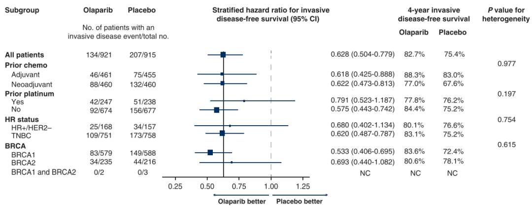 第二个重点研究是OlympiA研究,这个研究主要是纳入的是HER2阴性、同时伴有BRCA基因突变的高危早期乳腺癌患者。本研究纳入的患者中激素受体阳性比例相对较少。在整体患者人群中,同时携带BRCA基因突变,且伴有高危因素,接受奥拉帕利治疗之后,3年和4年的iDFS率相比于安慰剂组均显著提升,且在激素受体阳性亚组人群中也呈现一定的获益,但获益趋势没有总体人群多[5]。因此针对激素受体阳性、HER2阴性早期乳腺癌患者辅助强化治疗,包括合并BRCA基因突变的患者,PARP抑制剂奥拉帕利可以作为一个备选项。或者针对一些极高危的患者,我们也可以尝试使用奥拉帕利的强化治疗。然而目前在这些患者中可能还是以CDK4/6抑制剂强化治疗为主,PARP抑制剂奥拉帕利强化为辅的一个治疗现状。