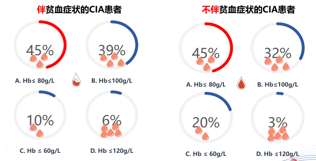 这项真实世界研究发现,24%肿瘤患者因贫血导致化疗剂量减少或化疗延迟[6]。尽管Hb≥80 g/L是指南建议的化疗下限值,但约60%的受访者认为Hb≥100 g/L有利于患者完成预定剂量化疗方案。同时,不论是否伴有CIA症状,均有45%医生在Hb降低至无法满足化疗要求(Hb<80 g/L)时才会考虑纠正贫血,而指南推荐为Hb≤100 g/L即可启动治疗(图3)。