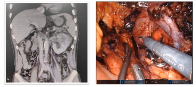 如下图所示,该病例瘤栓充满整个下腔静脉,同时长满血栓,对于该病例我们采用全封闭式的En-block切除,首先是离断下腔静脉,翻起来以后去找寻右肾动脉,切断右肾动脉以后再把左肾静脉切断,然后一直沿着瘤栓向肝后寻找游离肝门后方腔静脉。既往类似病例中肝门后方腔静脉很难暴露清楚,但是有了机器人助力,使其充分显露出来就变的相对容易很多。肝后下腔静脉经过充分游离后,再将瘤栓全部挤压进入腔静脉中,然后探查至无瘤栓处,直线切断腔静脉,将瘤栓取出。完全封闭式的瘤栓取出,可以获得很好的操作空间。该病例曾在2023年4月在第8届泌尿生殖系统研讨会上进行演示。