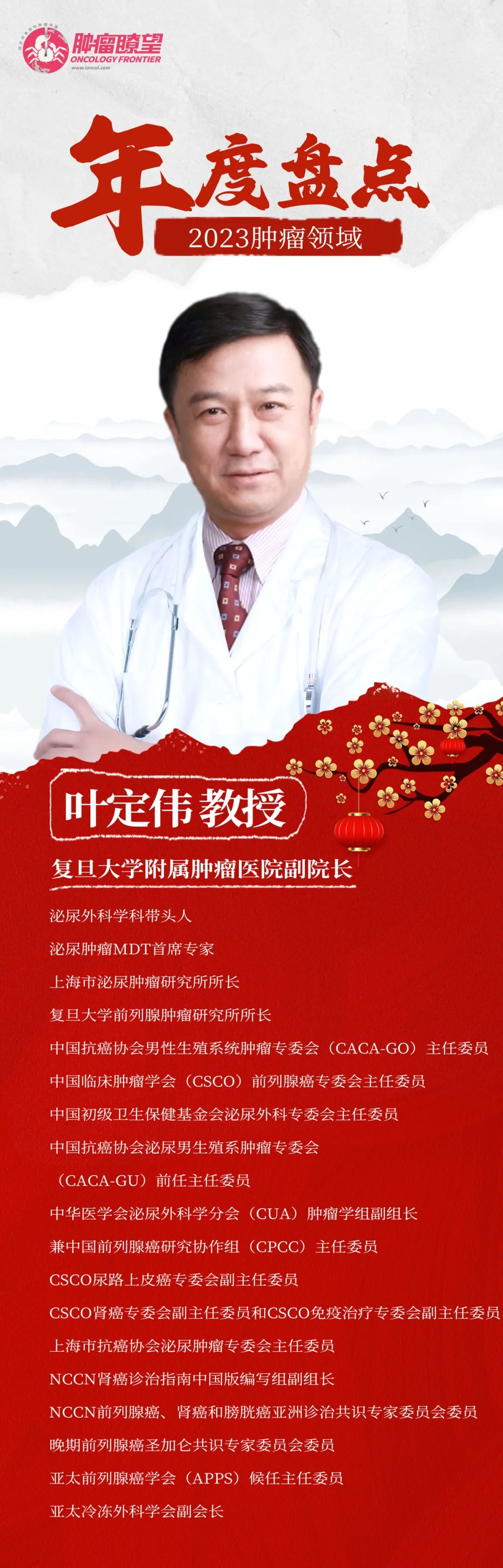 编者按:踔厉奋发,笃行不怠。在过去的一年里,中国前列腺癌专家与全球同道,致力于攻克“蓝颜杀手”前列腺癌,为患者提供更加优效、更加方便、更加可及的创新治疗方案,并取得了一系列的重要研究成果。在此辞旧迎新之际,《肿瘤瞭望》特邀复旦大学附属肿瘤医院叶定伟教授,回顾2023年前列腺癌药物治疗领域的研究进展,一起展望前列腺癌临床实践的变化,并以更多创新治疗方案惠及中国前列腺癌患者,助力“健康中国2030”伟大蓝图的实现。