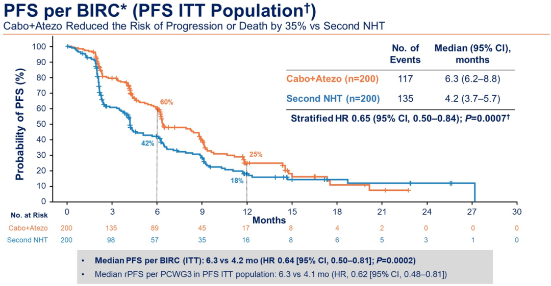 这项研究其实具有一定的历史背景。众所周知,卡博替尼在前列腺癌的治疗中有众多尝试,既往COMET-1研究分析了卡博替尼治疗骨转移CRPC患者的疗效,虽然结果显示中位rPFS有所改善,但最终OS并无显著获益,因而卡博替尼单药治疗未能获批。随后进行了COSMIC 021研究,亚组分析表明卡博替尼联合阿替利珠单抗安全性良好,并且伴内脏转移或盆腔以外淋巴结转移患者的DCR和PSA反应率优于单药治疗,因而才进行了这项CONTACT-2研究。