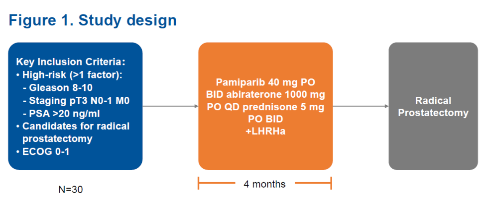 本研究为一项单中心、开放标签、单臂的II期临床研究,该研究纳入了未经治疗的前列腺癌患者,所有患者均至少有一项危险因素(分期≥T3a,Gleason评分≥8或PSA≥20 ng/ml),患者接受帕米帕利40 mg每日两次口服,阿比特龙1000 mg每日一次口服,泼尼松5 mg每日两次口服,以及ADT治疗,总计4个月的新辅助治疗,随后进行RP(根治性前列腺切除术)。主要研究终点是病理完全缓解(pCR)或微小残留病灶(MRD)的发生率。MRD定义为肿瘤≤0.5 cm或残余癌负荷(RCB)≤0.25 cm3。次要研究终点包括PSA反应、病理降期率、手术切缘阳性率、术后12个月PSA复发率及安全性。