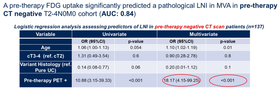 尽管T2-4N0-1M0 MIBC中FDG-PET阳性患者的比例不高,但无论治疗类型如何,仍能够预估这些患者对新辅助治疗反应不佳。FDG-PET对骶前LN区域和VH患者的LNI预测能力较低。在新辅助治疗试验中选择患者时应严格考虑这些信息。