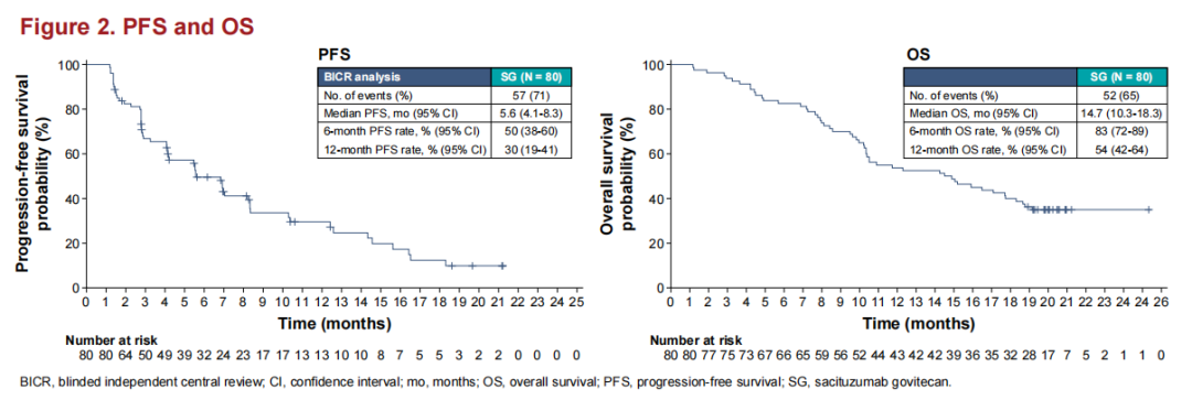 SKB264也是一种抗体偶联药物,由抗Trop-2抗体与具有细胞毒性的贝洛替康衍生物通过一种新型连接物耦合。江苏省人民医院殷咏梅教授团队牵头开展的SKB264治疗mTNBC的最新疗效和安全性数据也证明了TNBC患者可以从SKB264治疗中获得持续的缓解和长期OS获益。2023年SABCS大会上公布的最新疗效和安全性数据显示,59例经治的mTNBC患者接受SKB264单药治疗,每两周给药一次。中位随访22.8个月(95%CI:21.3~25.2),ORR为42.4%(25/59,其中22例确认,3例未确认),疾病控制率(DCR)为76.3%(45/59)。缓解持续时间(DoR)中位数为11.5个月(3.7~22.1+)。中位无进展生存期(mPFS)为5.7个月(95%CI:3.8~9.1)。中位总生存期(mOS)为16.8个月(95%CI:12.7~NE),12个月和24个月的总生存率分别为65.0%和39.5%。更新的数据表明,经过多线治疗的转移性三阴性乳腺癌患者可以从SKB264治疗中获得持续的缓解和长期OS获益,且安全性可控,Trop-2高表达的患者展现出较高的应答率。