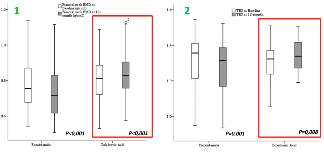 △BonEnza研究:恩扎卢胺+骨保护剂可相较基线改善18个月股骨密度(1)和小梁骨密度(2)