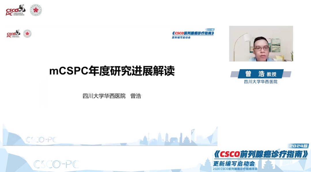 接下来的学术环节,由中山大学附属肿瘤医院周芳坚教授、北部战区总医院谢晓冬教授、上海市交通大学附属新华医院齐隽教授主持,四川大学华西医院曾浩教授为我们带来了《mCSPC年度研究进展解读》:转移性前列腺癌的治疗格局在过去10年发展迅速,几项具有里程碑意义的试验结果表明,在疾病较早阶段采用ADT、ARIs和化疗联合强化治疗具有一致的生存优势;在临床实践中需要进一步优选获益人群,比如根据治疗反应来指导后续治疗,对于药物治疗相对敏感、PSA快速下降的患者,采用局部治疗手段,如放疗等,对于低瘤负荷患这可能需要进一步探索治疗手段;IDC-P相比,PAC具有更多与患者不良预后相关的基因的高表达,且在细胞周期信号通路以及AR信号通路上活化显著。从这些通路切入设计新的治疗策略是改善具有IDC-P成分的前列腺癌患者不良预后的新方向。