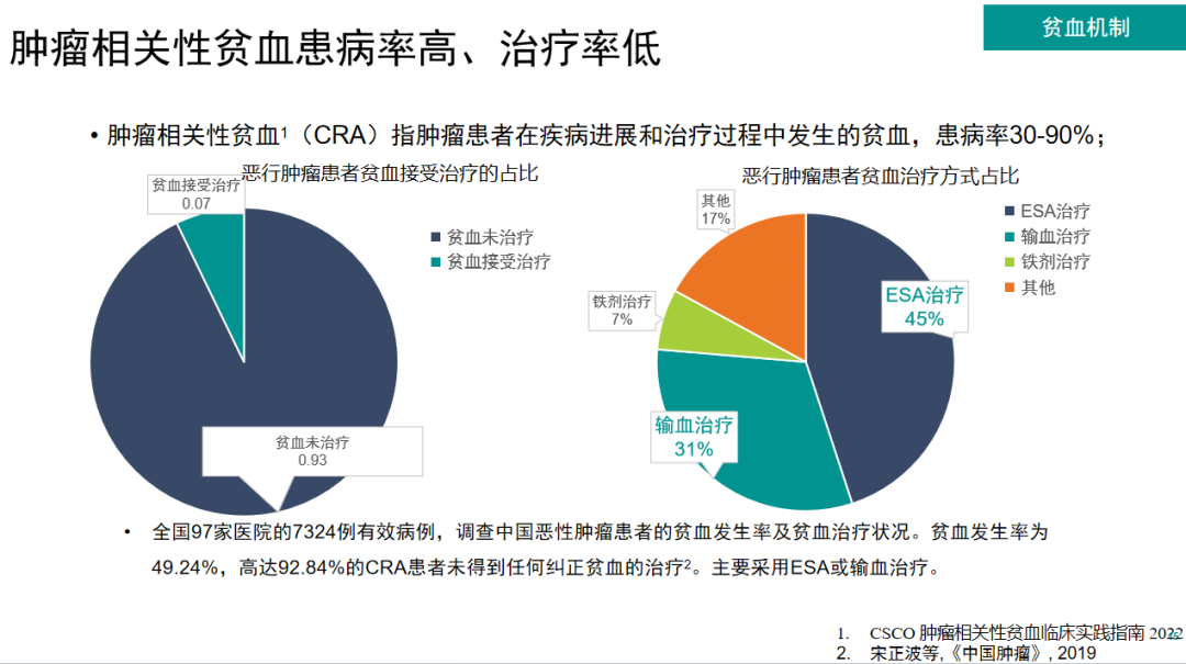 肿瘤相关性贫血(CRA)[7]指肿瘤患者在疾病进展和治疗过程中发生的贫血,患病率在30~90%之间,其患病率高、治疗率低。我国一项覆盖97家医院7324例患者的调研显示,贫血发生率为49.24%,高达92.84%的CRA患者未得到任何纠正贫血的治疗[9],主要采用红细胞刺激生成剂(ESA)或输血治疗,因此,提升临床医生正确的贫血管理观念已经刻不容缓。