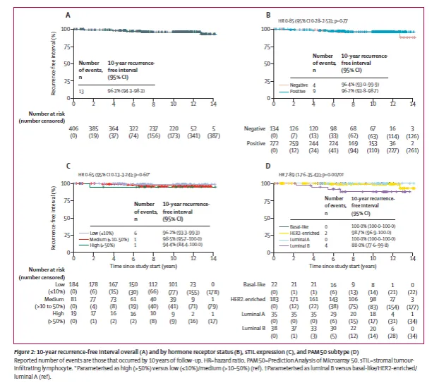 10年RFI率为96.3%(95%CI 94.3–98.3;图3A)。共发生13起RFI事件,包括6起局部同侧复发、6起远处复发和1起乳腺癌相关死亡。根据激素受体状态、sTIL表达(事后)和PAM50亚型(事后)分层的10年无复发间隔如图3A–D所示。