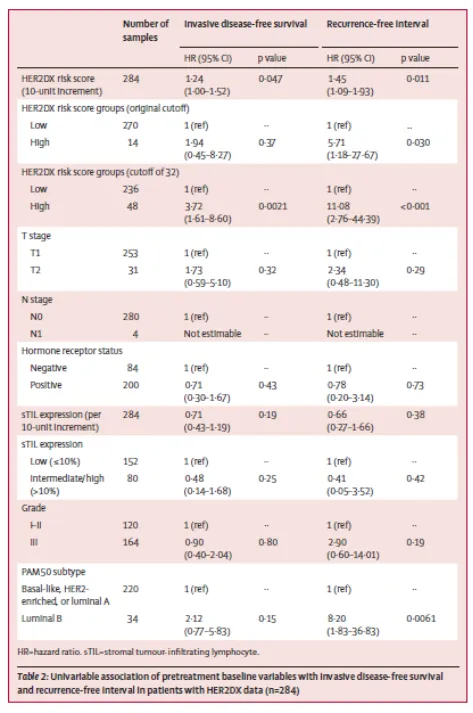 图5 HER2DX数据:患者(n=284)治疗前基线变量与无浸润性疾病生存期和无复发间隔时间的单因素相关性