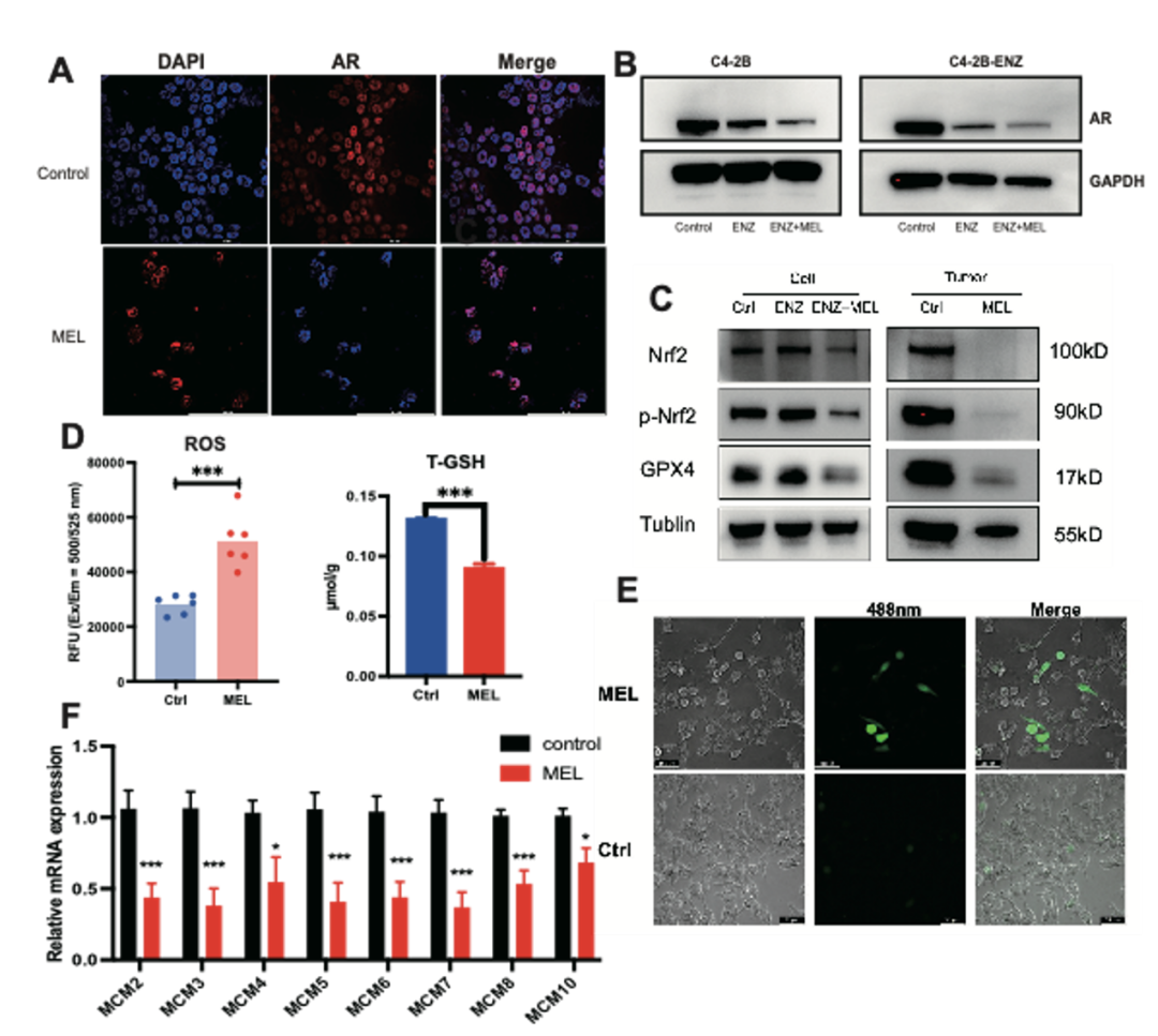 结果:MEL抑制前列腺癌细胞增殖,促进前列腺癌细胞凋亡,逆转前列腺癌细胞对恩杂鲁胺的耐药。Transwell和高内涵实验表明,MEL还可以抑制PCa细胞的转移。体内实验表明,MEL腹腔注射可以显著抑制皮下移植肿瘤的生长,延长小鼠的生存时间。在机制上,我们发现MEL干预阻碍了AR的液-液相分离(LLPS)行为,受损的AR可以形成转录活性凝析物,蛋白水平显著下调。减少的AR通过降低Nrf2的磷酸化来抑制GPX4的表达,从而导致PCa中的铁死亡表型,即总谷胱甘肽(T-GSH)含量降低和活性氧(ROS)水平增加。此外,AR减少还可以降低MCM家族(MCM2-10)的表达,抑制细胞周期,降低细胞增殖。