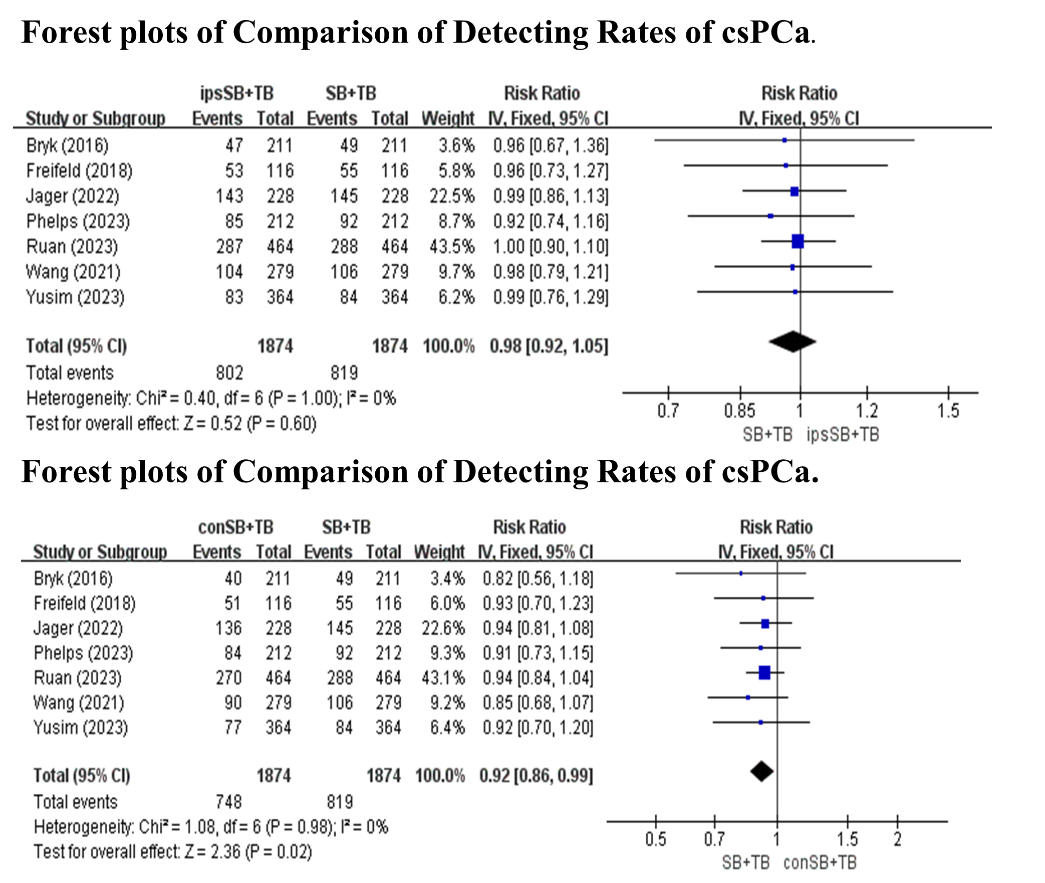 方法:截至2023年12月,我们在Cochrane、Embase、Ovid和PubMed数据库中进行了全面的文献检索,8项研究被纳入分析。计算ips-SB、con SB+TB和SB+TB检测到的PCa和临床显著PCa(csPCa)的相对灵敏度(RR)和95%置信区间(CI)。此外,我们还确定了con-SB+TB、con-SB+TB和SB+TB之间的RR,并根据纳入患者的单侧瓣内病变数量进行亚组分析。