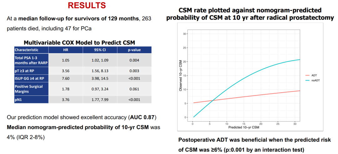 另一项研究(摘要号:A0519)则是关于辅助内分泌治疗的人群筛选。这项来自欧洲的多中心回顾性研究,纳入将近1万例接受机器人辅助前列腺癌根治术(RAPR)的患者,其中有3173例在RAPR术后1—3个月内PSA>0.1 ng/ml。研究结果显示,辅助ADT可改善部分患者的肿瘤学预后,尤其是使用模型预测10年癌症特异性死亡(CSM)风险≥6%的患者,辅助ADT的获益显著(下图右)。
