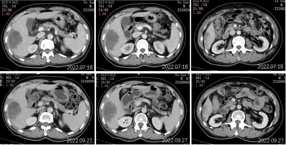 2022.07.19行全腹部平扫+增强:肝右叶可见一类圆形稍低密度影,累及肝S5-8段,边界欠清,约80mm*50mm*98mm大小,密度欠均匀,增强动脉期病灶边缘轻度强化,门脉期边缘环状强化更为明显,中心见无强化坏死区,病灶周围S6段另见数个小结节样类似强化灶;肝内另见数个类圆形低密度灶,径约7-25mm,增强扫描未见强化。