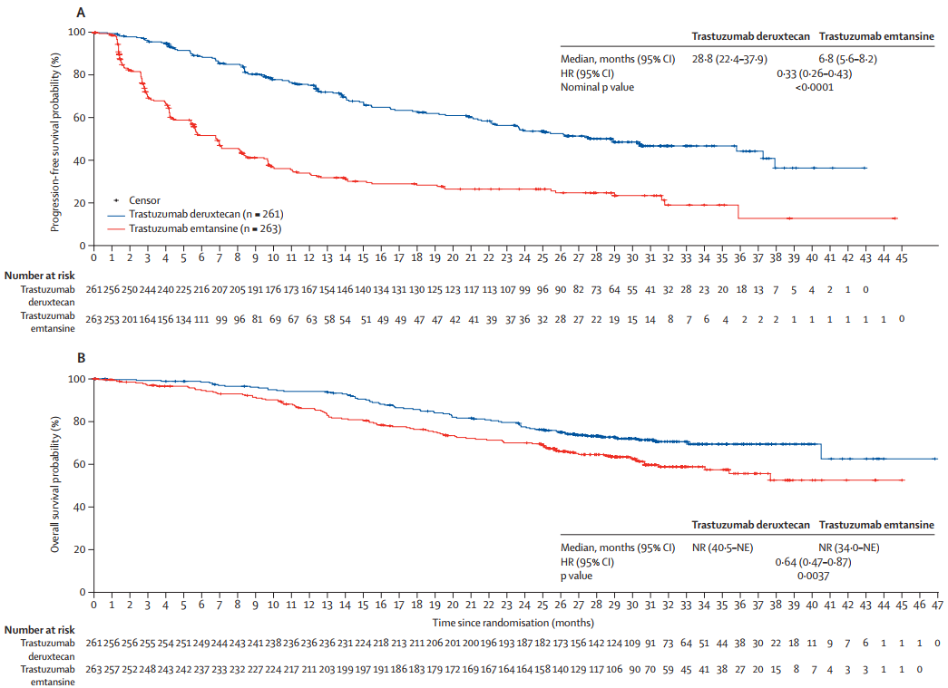 DESTINY-Breast03的主要研究终点:PFS(上图)和OS(下图)