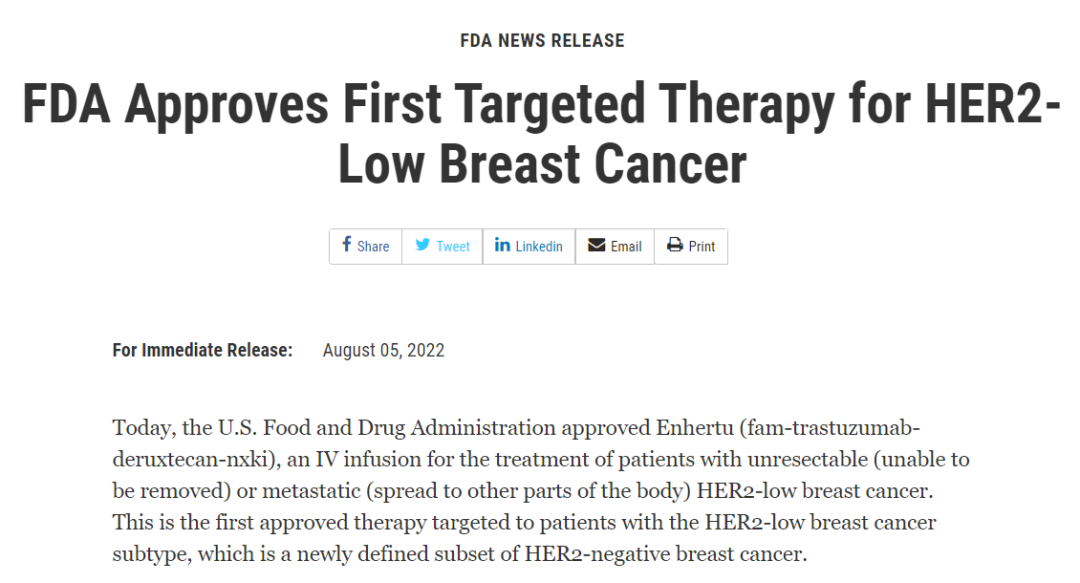 2022年8月5日,FDA批准T-DXd用于治疗无法切除或转移性HER2低表达(HER2-low)乳腺癌患者。