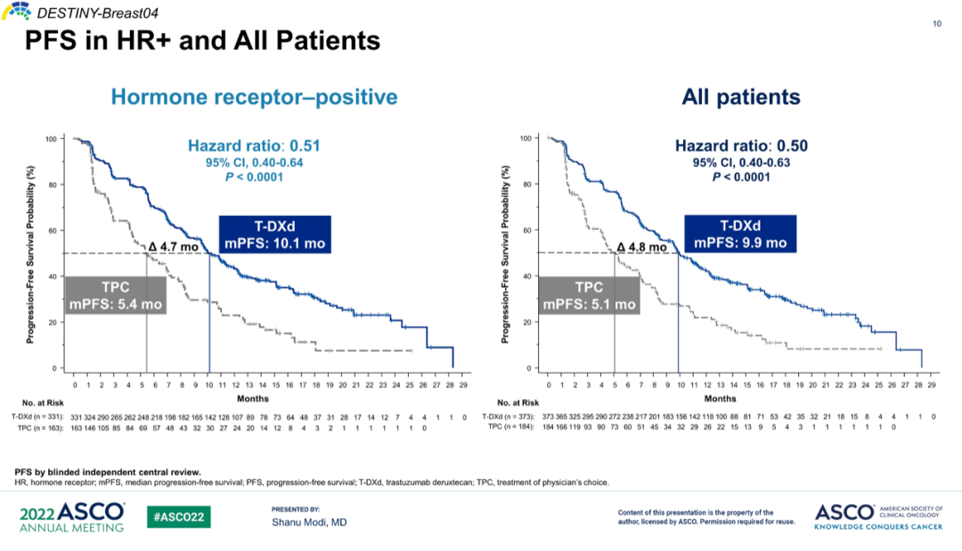 2个多月后,2022年美国临床肿瘤学会年会(ASCO)公布的DESTINY-Breast04研究带来了T-DXd治疗HER2低表达乳腺患者的PFS和OS双阳性结果[8],标志着T-DXd获益人群将从HER2阳性拓展至HER2低表达患者。从而为整个晚期乳腺癌的抗HER2治疗临床实践带来了变革。