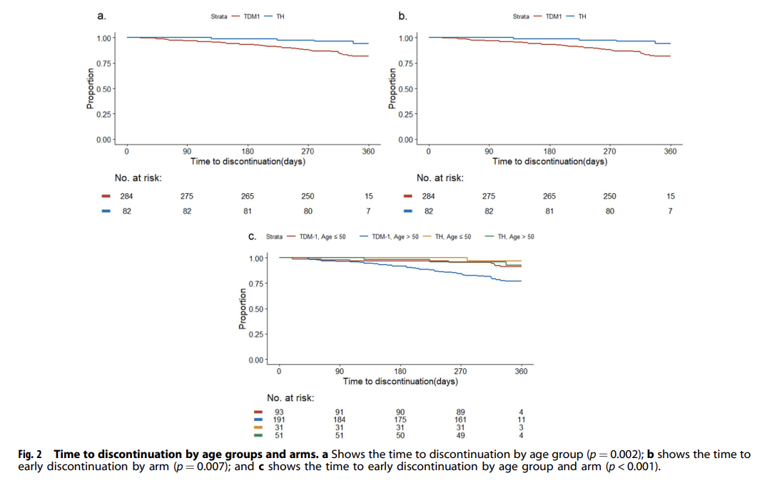 >50岁组停药时间明显短于≤50岁组(P=0.002,图4a),T-DM1组停药时间明显短于TH组(P=0.007,图4b)。接受T-DM1治疗的>50岁组人群停药风险特别高;而接受T-DM1治疗的≤50岁组、接受TH治疗的>50岁组和≤50岁组停药风险相当(P<0.001,对数秩检验,图4c)。在T-DM1停药后,25%(2/8)的≤50岁人群和45%(20/44)的>50岁人群改用曲妥珠单抗完成一年的辅助治疗。