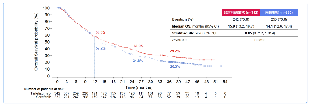 研究结果显示,替雷利珠单抗组中位OS非劣效于索拉非尼组(15.9 vs.14.1个月;HR 0.85,P=0.0398);24个月OS率(39.0%vs.31.8%)和36个月OS率(29.2%vs.20.3%)提示,替雷利珠单抗组OS有延长趋势,具有临床生存获益;亚组分析显示,所有亚组OS与总体人群中观察到的OS结果一致。与索拉非尼组相比,替雷利珠单抗组ORR更高(14.3%vs.5.4%)、缓解更持久(DoR:36.1 vs.11.0个月)。尽管替雷利珠单抗组的中位PFS更短(2.1 vs.3.4个月;HR 1.11)、6个月PFS率更低(28.8%vs.35.8%),但其在12个月时的PFS率与索拉非尼组相当(19.0%vs.18.1%),在18个月和24个月时,替雷利珠单抗组的PFS率高于索拉非尼组(18个月:16.1%vs.9.5%;24个月:13.9%vs.6.1%)。替雷利珠单抗组≥3级TRAE发生率更低(22.2%vs.53.4%),治疗导致的停药和用药调整也更少(停药:6.2%vs.10.2%;用药调整:20.1%vs.57.7%)。