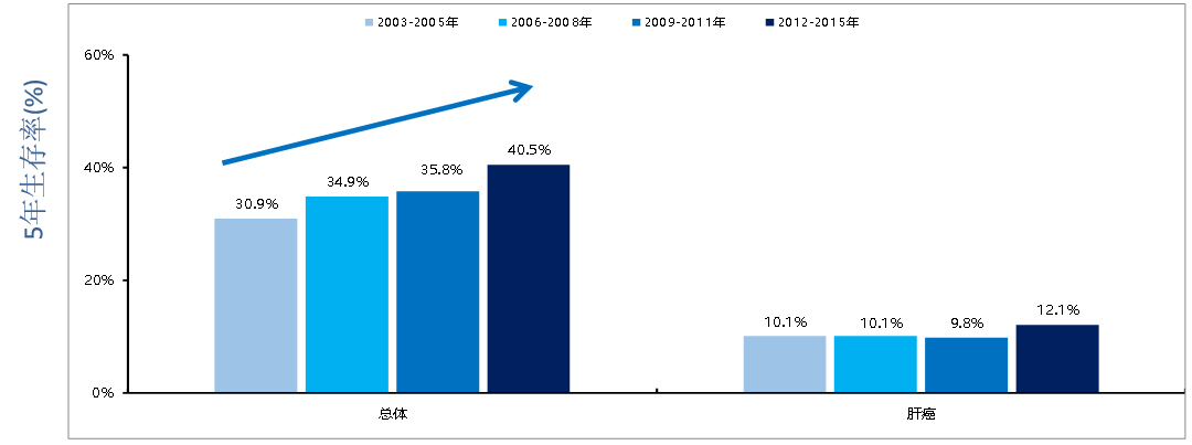 △中国癌症患者及肝癌患者的5年相对生存率
