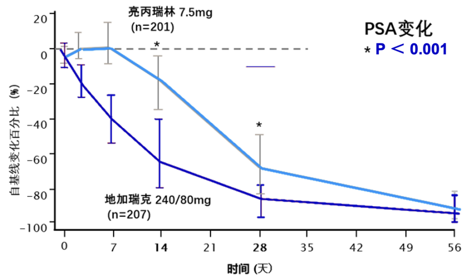 图4.使用亮丙瑞林或地加瑞克后0~56天患者PSA变化