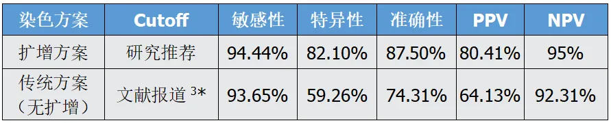 推荐cut-off值的敏感性和特异性均高于此前文献报道的cut-off值(≥1%):敏感性和特异性分别为94.44%vs.87.9%和82.1%vs.81.1%[4]。