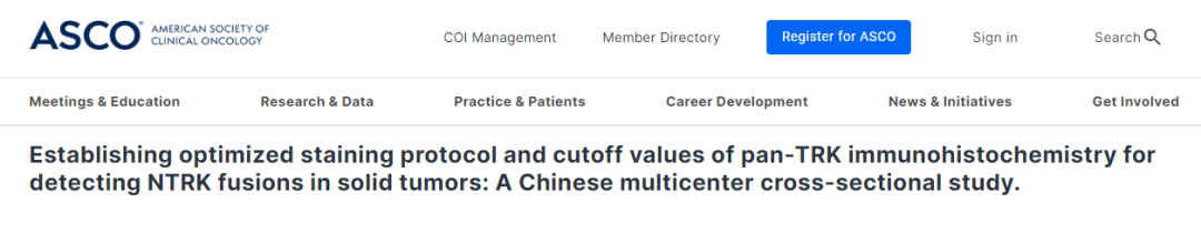 近日,由北京协和医院牵头的一项全国大型多中心临床研究——《为实体瘤NTRK融合突变检测建立优化的pan-TRK免疫组化染色方案和cut-off值:基于一项中国多中心横断面研究》(Establishing optimized staining protocol and cutoff values of pan-TRK immunohistochemistry for detecting NTRK fusions in solid tumors:A Chinese multicenter cross-sectional study)(以下简称“研究”)的摘要在2024年美国临床肿瘤学会(ASCO)官网重磅发布。
