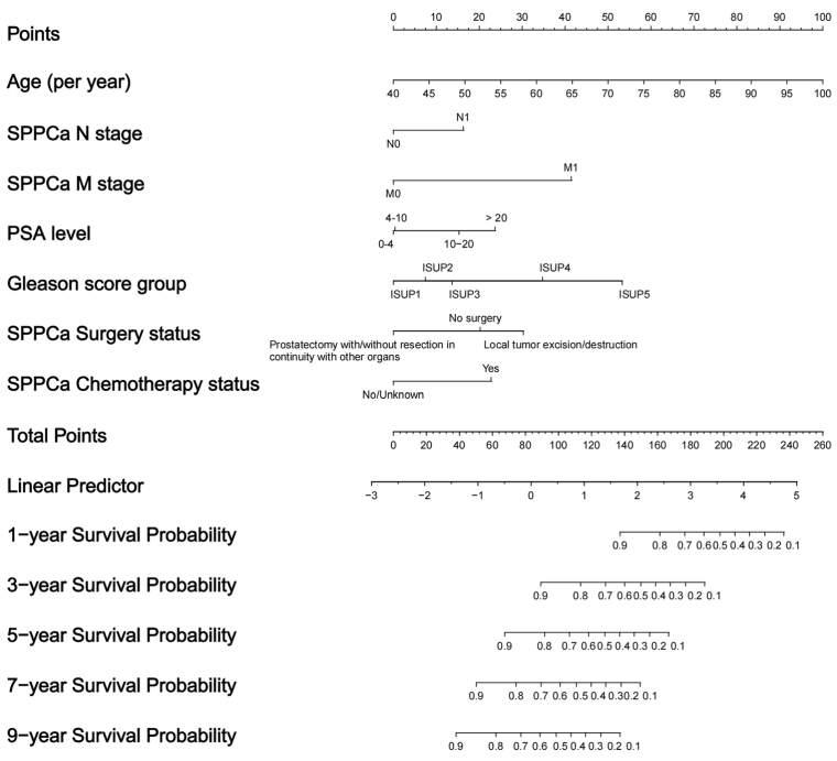 我们从SEER数据库中筛选出2010年至2015年SPPCa的患者,共纳入5342例SPPCa患者。患者中位年龄为68岁。中位随访时间为71个月。最常见的原发肿瘤部位是泌尿生殖系统(n=1527,28.6%),其次是消化系统(n=1283,24.0%)。SPPCa患者多为T1期(n=2708,50.7%)、N0期(n=5209,97.5%)、M0期(n=5174,96.7%)。多数患者的前列腺特异抗原(PSA)在4-10 ng/ml之间(n=3120,58.4%),Gleason评分多为ISUP1组(n=2080,38.9%)。治疗方面,分别有1701例(31.8%)、2054例(38.5%)和33例(0.6%)患者接受了手术、放疗和化疗。单因素和多因素Cox分析结果表明,年龄、多原发肿瘤发生的间隔时间、既往发生肿瘤的部位、SPPCa肿瘤分期、PSA、Gleason评分和治疗方式是影响患者总生存(OS)的独立预后因素。对于癌症特异性生存(CSS),年龄、肿瘤分期、PSA、Gleason评分、SPPCa治疗方式是独立的预后因素。Kaplan-Meier分析显示,年龄较小、TNM分期较低、PSA较低、Gleason评分较低、接受前列腺根治性切除治疗的患者有更好的生存预后。既往患有呼吸系统肿瘤的患者(5年OS:64.4%,10年OS:38.3%;5年CSS:91.7%,10年CSS:84.0%)、口腔咽部肿瘤(5年OS:75.7%,10年生存OS:56.8%;5年CSS:88.6%,10年CSS:83.7%)生存期最短,而既往有内分泌系统肿瘤的患者预后最好(5年OS:91.6%,10年OS:86.6%;5年CSS:97.2%,10年CSS:97.2%)。
