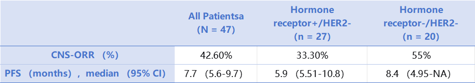 本届ASCO大会上,我们首次公布了队列A的CNS-ORR和PFS结果。2022年5月5日至2023年10月25日,共纳入47例患者,中位年龄为53岁(范围,45~59岁)。其中35例为未经局部治疗的新发活动性脑转移,12例为脑部放疗后出现进展的患者。总人群中,CNS-ORR为42.6%。截至2024年1月8日,中位随访时间为14.6个月,中位PFS为7.7个月(95%CI:5.5~10.8)其中,HR+/HER2-患者的CNS-ORR为33.3%,中位PFS为5.9个月,HR-/HER2-患者的CNS-ORR为55%,中位PFS为8.4个月(表1)。不良事件(AEs)主要为1~2级,最常见的不良事件为周围神经病变(89.4%)、ALT/AST升高(59.6%)、白细胞计数减少(51.1%)、中性粒细胞计数减少(68.1%)、贫血(51.1%)、腹泻(38.3%)、便秘(29.8%)、血小板计数减少(21.3%)和肌酐升高(21.3%)。研究证实,优替德隆对脑转移灶具有良好的抗肿瘤活性,且安全性可控,为HER2-BCBM患者提供了新的治疗选择。