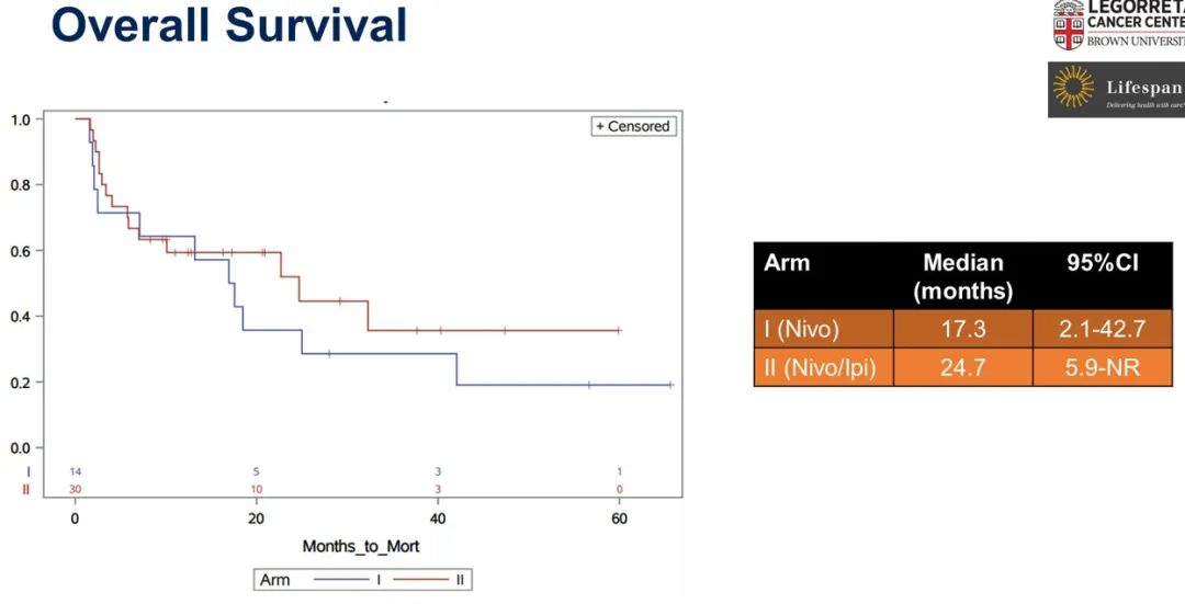 比较单一免疫治疗和两种免疫药物联合使用的生存数据:中位PFS分别为2.2个月和5.6个月,中位PFS分别为17.3个月和24.7个月。重要的是,对纳武利尤单抗+伊匹木单抗联合治疗有应答的患者,其治疗反应具有持久性,并且有几名患者仍在参加临床试验,并且能够继续接受治疗超过两年。
