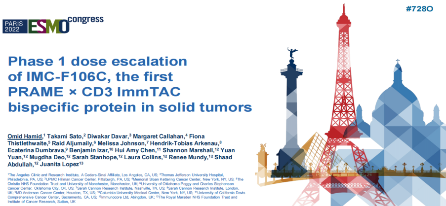 [2]O.Hamid,T.Sato,D.Dava,et al.Results from phase I dose escalation of IMC-F106C,the first PRAME×CD3 ImmTAC bispecific protein in solid tumors.ESMO 2022;Abstract 728O.